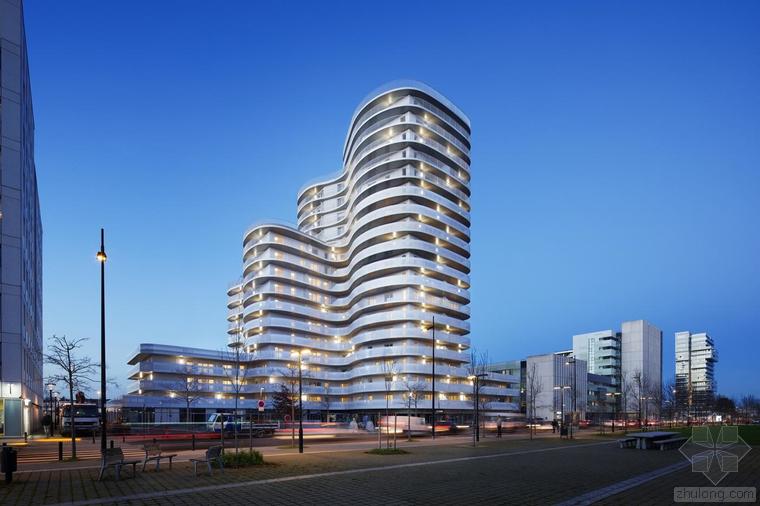 這是一棟建造于核心區(qū)位的獨(dú)特建筑。New’R大樓由流線型的折角和四周波浪起伏的陽(yáng)臺(tái)構(gòu)成,這樣的造型設(shè)計(jì)不僅是在向奧斯卡•尼邁耶致敬,還是在向上世紀(jì)七十年代法國(guó)里維埃拉的建筑(例如由André Minangoy 和 Michel Marot設(shè)計(jì)的天使灣碼頭)致敬,最后還暗示了快樂(lè)主義者對(duì)邁阿密海灘的幻想。這座建筑顯得感性而又賦有多向性,其所在位置在“畢加索郵路”和目前沿鐵路基礎(chǔ)設(shè)施設(shè)置的、尚處于開(kāi)發(fā)階段的新住區(qū)之間的重要節(jié)點(diǎn)上。New’R大樓對(duì)現(xiàn)有場(chǎng)地的構(gòu)建體現(xiàn)在對(duì)基地形成的環(huán)擁之勢(shì)和對(duì)新景觀的塑造。